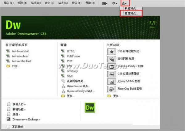 首先打开dreamweaver,在菜单栏中找到“站点”——“管理站点”,如下图所示。