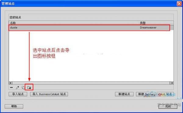 打开“管理站点”对话框,我们可以选择需要导出的站点,如下图中的“duote”,选择站点后点击“导出”图标,如下图所示。