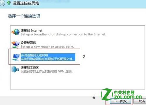 5、选择“手动连接到无线网络”然后点击“下一步”如果没有此选项请检查无线网卡是否正常或者被禁用;