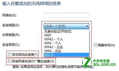 除了“无身份验证(开放式)”之外,选择其他的“安全类型”都会默认自动勾选上“自动启动此连接”。