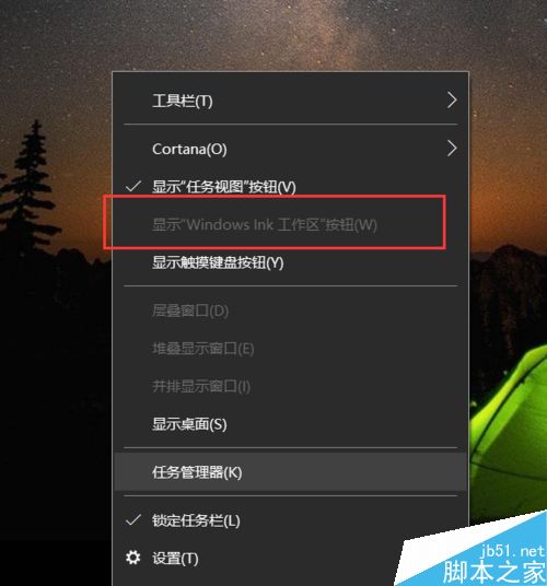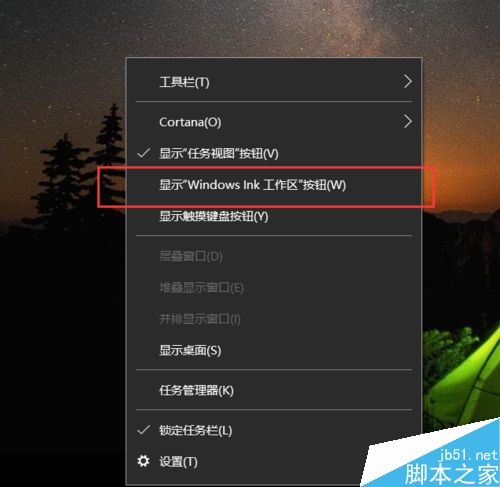 1、首先,我们先来看看Windows Ink功能在哪里显示,这里我们对着桌面上任务栏击右键,选择“显示Windows Ink工作区按钮”选项。