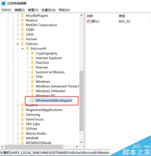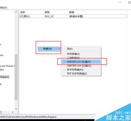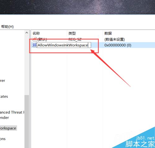 9、接下来,我们会看到新建立的子键值,然后将该子键值命名为“AllowWindowsInkWorkspace”,并保存对注册表的修改。
