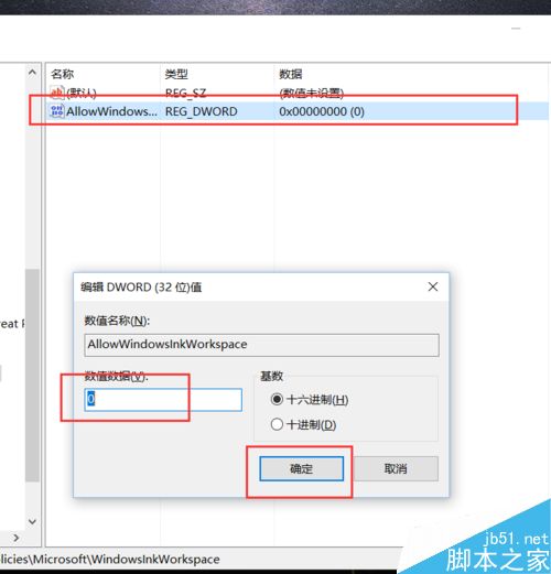10、接下来,我们保持默认的键值为“0”,不要修改该键值;如果你想要重新开通Windows Ink功能,可以将键值修改为“1”,并点击“确定”按钮。