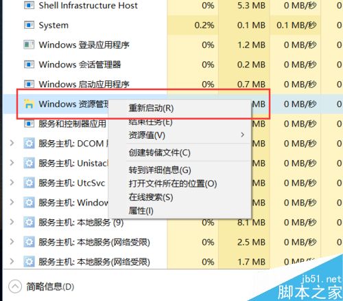 11、接下来,我们在任务栏中击右键,打开任务管理器,然后在任务管理器中执行“重新启动Windows资源管理器”选项。