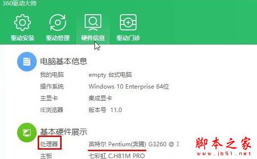 3、检查完成后,切换到“硬件信息”界面,在下面我们看一下处理器的型号,是【英特尔】还是【AMD】的;