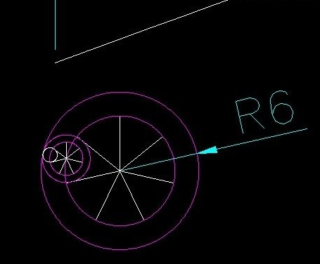 2、画一圆做钢丝绳的外径(尺寸参考R=6)分7等份,切、切、切画一小圆,以R6的圆心到小圆圆心作一圆,剪切等份线,留下七星线。同样在小圆内分7等份画一小小圆,并剪切等份线留下小七星线。如图:需要的是白图层线,粉红图层线就不需要了。