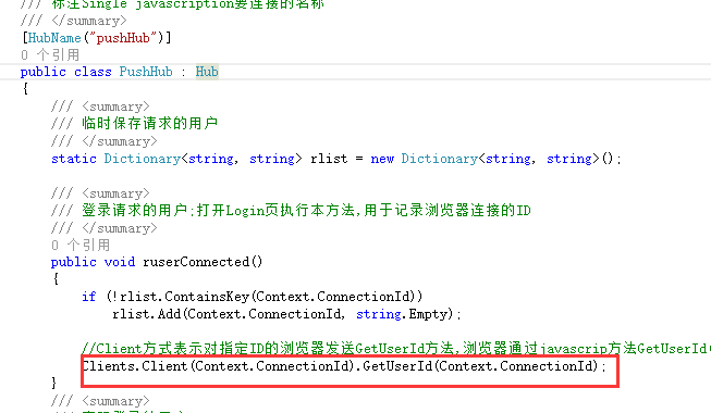 //Client方式表示对指定ID的浏览器发送GetUserId方法,浏览器通过javascrip方法GetUserId(string)得到后台发来的Context.ConnectionId