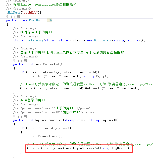 //Client方式表示对指定ID的浏览器发送GetUserId方法,浏览器通过javascrip方法userLoginSuccessful(bool,string)得到后台发来的登录成功,和微信OPENID