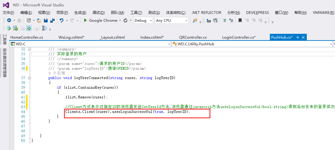 *4.REDIRECT_URI应回调到WxLog页并进行URLEncode编码,如: redirect_uri=GetURLEncode("http://你的网站/Login/WxLog?ruser="); ruser为PushHub中的Context.ConnectionId到View中配置