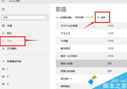 1、按之前的步骤添加歌曲进播放器,然后我们我们点击左侧”歌曲“栏,然后右上点击”选择“按钮。
