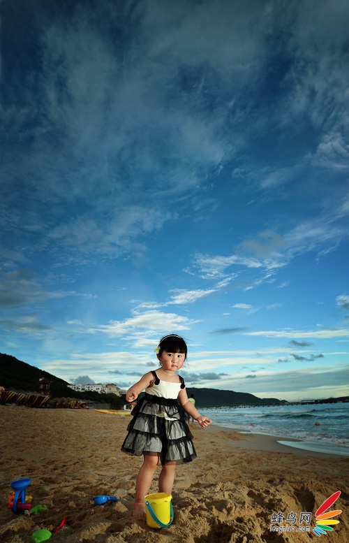 补光时为了使近景中的人物及沙滩有一定立体感,尽量避免顺光补光。我用的是前侧光。20mm的超广角可容纳进更多的天空,画面也更具广角应有的特性—视觉冲击力。