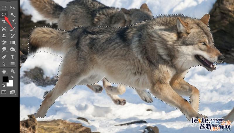 首先我们要把这匹中间的狼给抠出来,有时我们会遇到很多不方便取材的素材图,比如这张混在复杂环境里的狼,抠图时一定要有耐心!抠图的方法有很多大家可以按照自己顺手的方法来抠取,这里我直接使用套索工具沿着狼的外轮廓进行勾勒来得到选区,如图:
