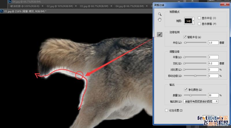 再用平移和缩放工具操作图片,在把狼清晰毛发的部位找到,点“半径调整画笔”,用键盘上“【】”调整画笔大小,用一个较小的画笔沿着清晰毛发部位(如图红色路径示意)画一笔,要一笔完成,松开后电脑会自动计算毛发。