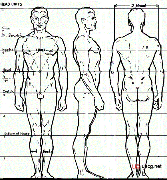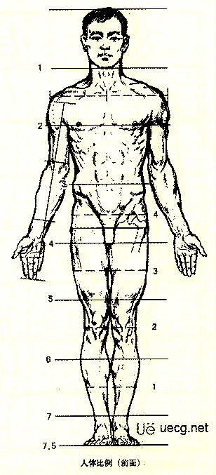 在欧洲的人体造型中,一般采用以身高和头高相比来表示人体的比例。如下图:理想化的男性成人直立时,头高为身高的1/8。从正面看,头顶至足底之半处,是耻骨联合处。上半身的一半为乳头横平线,从这里到头顶的一半为一头高。从乳头横平线至耻骨联合处的一半,又恰好是脐孔。从耻骨联合处往下为人体的下半部,它的一半为小腿机端的胫骨粗隆处(约膝关节稍下)。