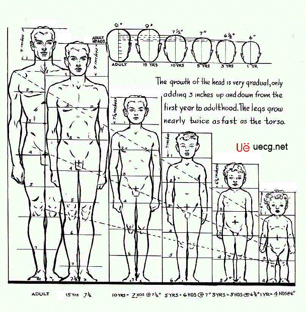 从眉毛往上一个鼻子的高度是发际线的位置,耳朵的高度正好是从眉毛到鼻底。从头的宽度来看,头部是五眼宽,嘴巴略宽于鼻子,整个脸颊大约有三个嘴宽。从侧面看,最主要的比例就是从眼角到嘴角的长度和眼角到耳朵的长度相等。小孩最大的区别就是头部的中线在眉毛处,随着年龄增长中线逐渐移至眼部。其它一些细节请大家自己参照比较吧。