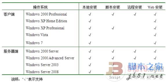 在安装部署前,需先仔细阅读产品使用手册中关于应用环境的要求,避免杀毒软件安装失败或安装后无法正常使用。瑞星杀毒软件网络版针对不同的环境需求,提供了多种客户端安装部署方式,包括本地安装、脚本安装、远程安装和WEB安装。客户端数量较多的用户,可以根据自己的环境使用后三种安装方式,以提高部署效率。其中脚本安装只限于具备域环境的用户使用;而远程安装目前只支持windows 2000 和SERVER系统。所以,最为推荐的部署方式为WEB安装,只需在网内配置一台IIS服务器,客户端用户通过访问内部站点的方式下载安装包安装即可。这四种安装方式适用的操作系统状况请参见图2。