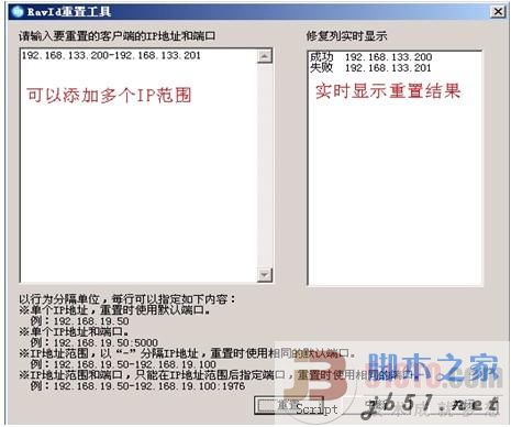 在管理控制台客户端列表中,客户端是依据MAC地址显示的。但是在很多企业内部,为了快速安装,多台客户端计算机会使用同一Ghost版系统。这种情况将导致部分客户普遍遇到的问题——客户端安装好后,中心指向没有问题,升级没有问题,甚至还可以接受策略,但就是在管理控制台无法显示。这正是Ghost版操作系统导致的,管理控制台将获取到的是相同的MAC地址,但是只能在线显示一台客户端的信息,还会出现客户端信息刷新变更的情况,几台客户端轮流显示。这时,在管理控制台看到的客户端数量和实际的安装数量就会存在出入。如果这样的客户端数量较少,可以手动删除客户端C:\WINDOWS\RavID.ini文件,重启计算机即可。如果客户端数量较多,则可以使用RavID重置工具批量解决问题。打开【开始】/【所有程序】/【瑞星杀毒软件网络版】/【瑞星工具】/【RavID重置工具】,该工具适用的前提是客户端须处于开机状态,添加无法正常显示的计算机IP地址后,点击重置即可,如图6所示。提醒:切勿对显示正常的客户端使用此工具。