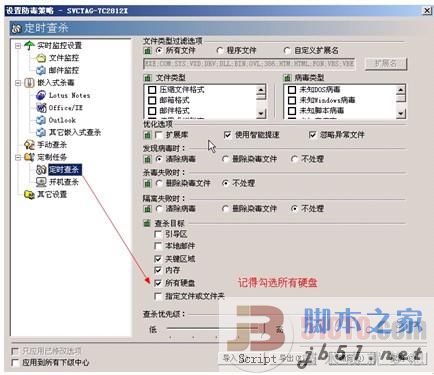 定期进行全网全盘杀毒可以及时发现局域网内流行的病毒,有效预防病毒的大规模扩散。一般用户都会根据企业工作时间的具体情况来安排定时杀毒时间,却往往忽略了查杀目标。默认查杀目标只包含关键区域和内存,效果当然不及全盘杀毒。在【设置防毒策略】/【定制任务】/【定时查杀】中,勾选所有硬盘,也可以扫描指定目录,如图7所示。