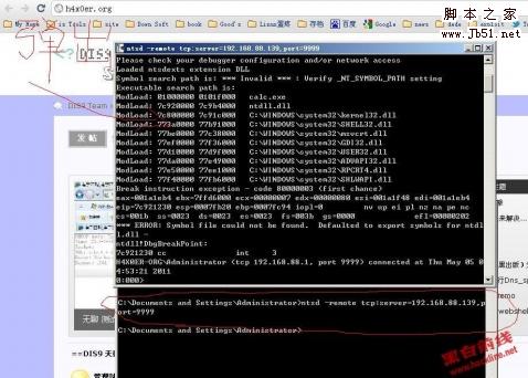 2.本机运行:ntsd -remote tcp:server=IP,port=端口,例如:ntsd -remote tcp:server=192.168.1.1,port=99。会弹出一个窗口。如果参数填写正确的话,会连接上目标机器,会显示命令类似提示符的界面,同时 server 端(就是第一步监听的那个)会显示:0:000> COMPUTER\netbar (tcp 192.168.1.3, port 99) connected at Fri May 06 13:49:59 2011,表示有人连接了,同时还显示连接的机器名,用户名,连接类型,IP地址,端口,时间等信息。