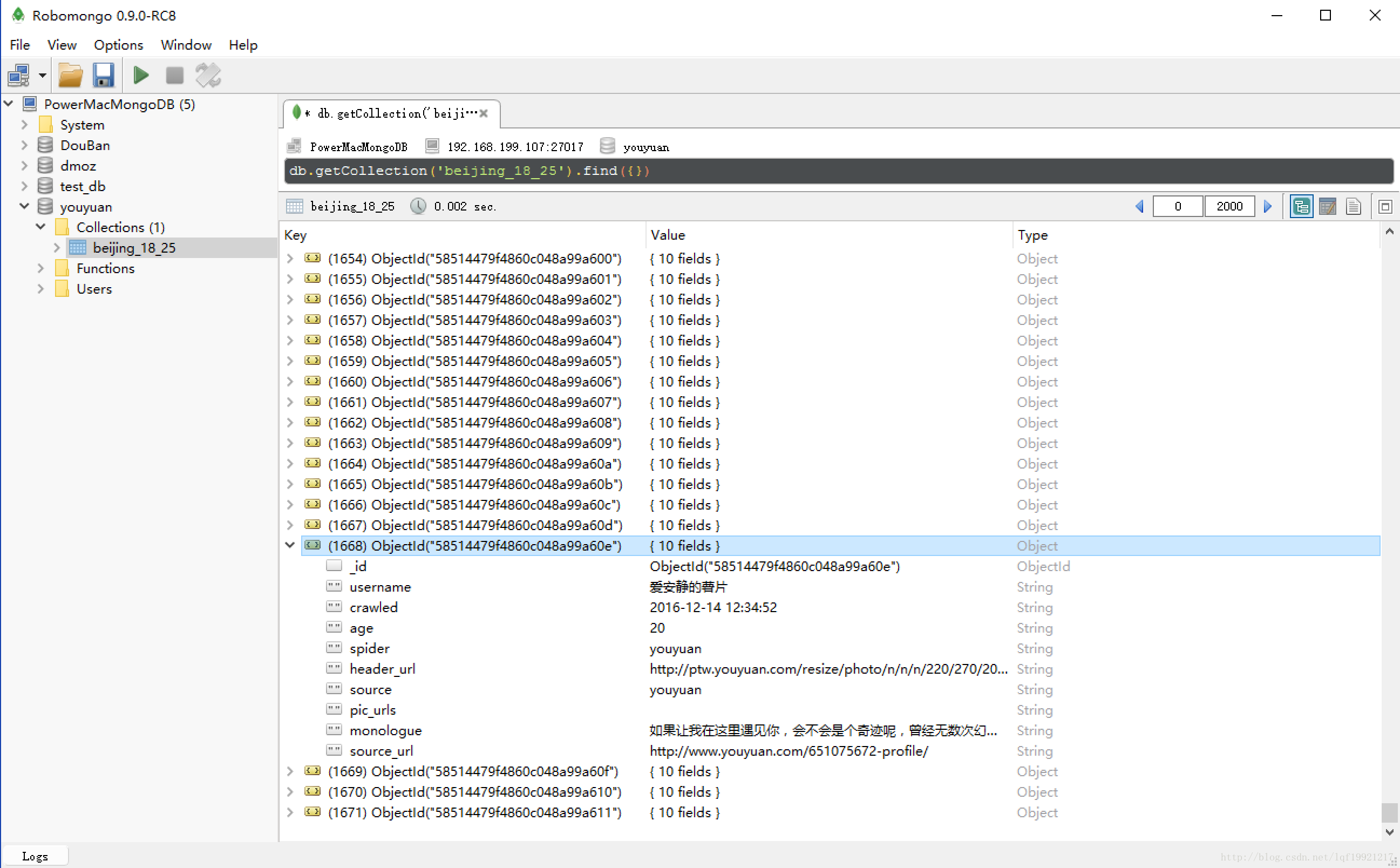 2.执行下面程序:py2 process_youyuan_mongodb.py