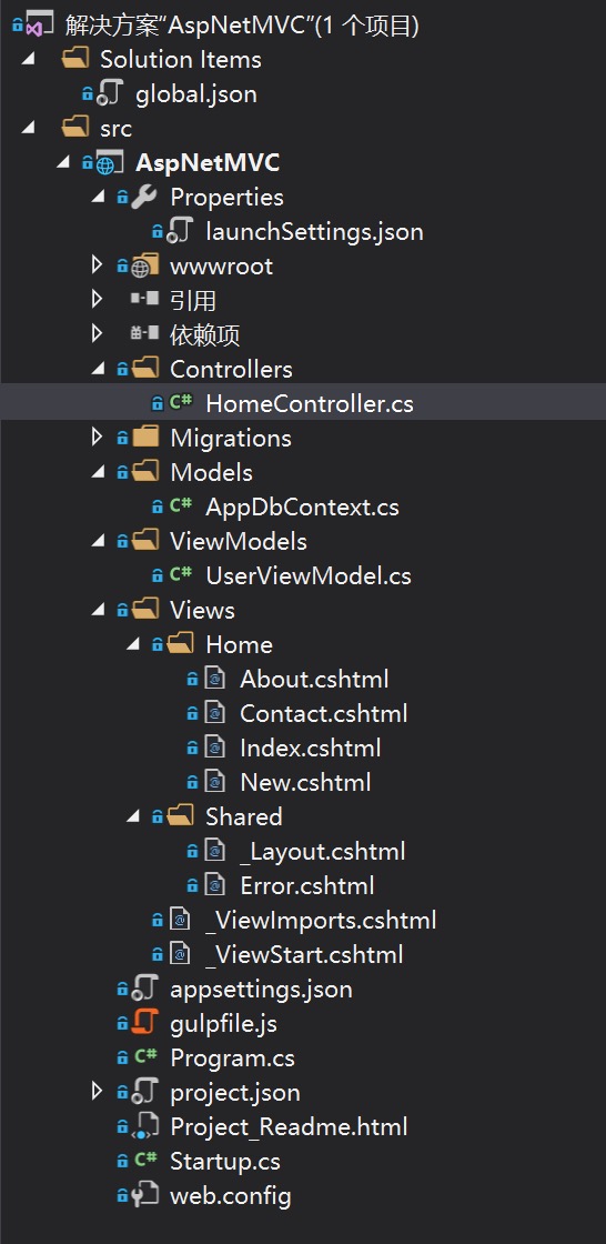 首先,创建一个 asp.net core 项目,然后在Controller文件件添加一个HomeController,然后在 Views 文件夹的 Home 文件夹里添加一个 New.cshtml 视图文件。如下图: