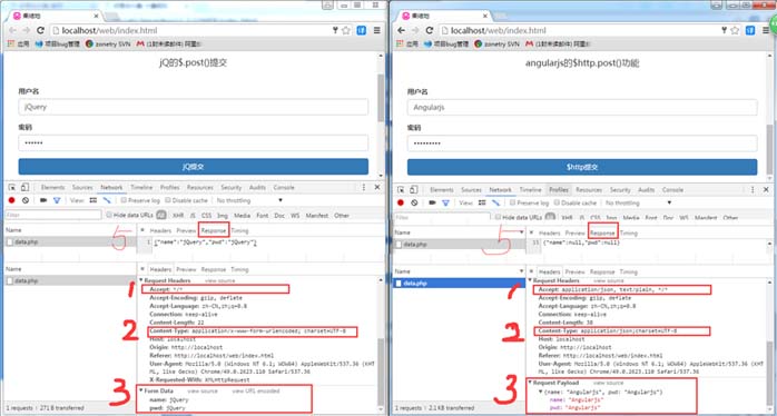 3是数据类型不同;jq发送的是Form Data;而angularjs默认发送的是json数据;