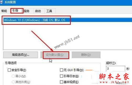 2、切换到“引导”选卡 在下面选中“Windwos 10”,点击【设为默认值】,点击应用并确定保存设置即可。