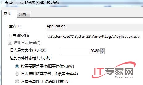 在上面这个窗口中,在定义了日志文件的限值后,还需要同时定义如果达到这个限值的话,该如何处理。在Windows7操作系统中这里有三个选项。其选项的种类跟2003操作系统是相同的。但是其在一些选项的设置上跟2003有所不同。