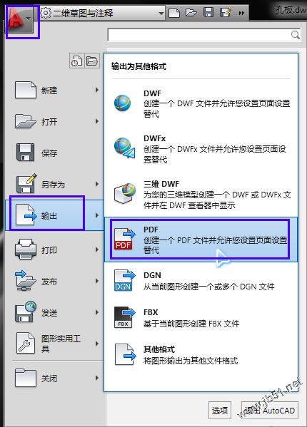 cad2011版本的输出pdf文件就非常方便了,在打开的cad截面中点击文件---输出---PDF如下图。