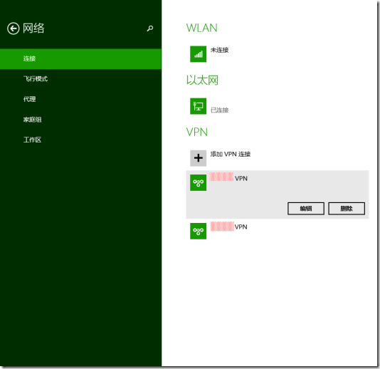 在 VPN 创建完毕后会自动弹出 Win8UI(之前叫 Metro,之后又改名为 Morden,挺混乱!这里就称为 Windows 8 用户界面吧,即简称:Win8UI)的网络栏,用户便可在这里选择 VPN 进行连接。即使我们在“适配器设置”中双击 VPN 连接也会同样会被切换到这个网络栏进行操作。