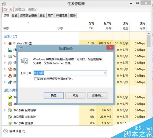 还有第二个办法就是通过修改注册表来解决。按键盘上的Ctrl+Alt+Delete出现一个页面后,选择”任务管理器“再点击”任务“→”运行新任务“,出现页面后输入regedit点击确定