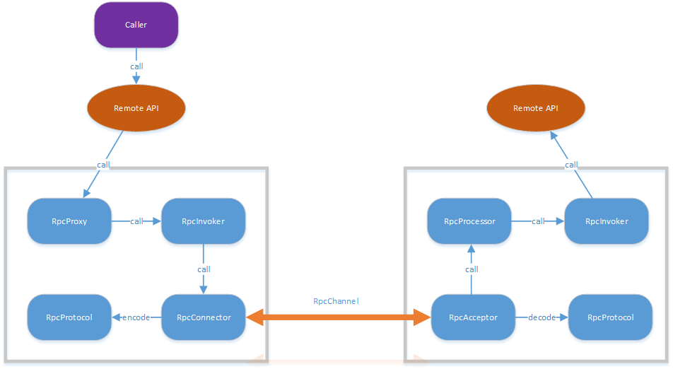 客户方像调用本地方法一样去调用远程接口方法,RPC 框架提供接口的代理实现,实际的调用将委托给代理RpcProxy 。代理封装调用信息并将调用转交给RpcInvoker 去实际执行。在客户端的RpcInvoker 通过连接器RpcConnector 去维持与服务端的通道RpcChannel,并使用RpcProtocol 执行协议编码(encode)并将编码后的请求消息通过通道发送给服务方。RPC 服务端接收器 RpcAcceptor 接收客户端的调用请求,同样使用RpcProtocol 执行协议解码(decode)。解码后的调用信息传递给RpcProcessor 去控制处理调用过程,最后再委托调用给RpcInvoker 去实际执行并返回调用结果。