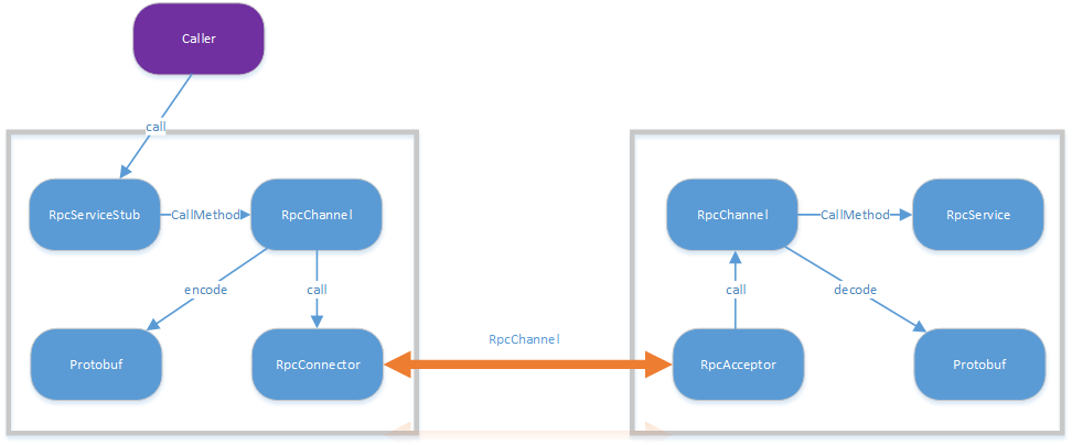 RpcServiceStub和RpcService类是protobuf编译器根据proto定义生成的类,RpcService定义了服务端暴露给客户端的函数接口,具体实现需要用户自己继承这个类来实现。RpcServiceStub定义了服务端暴露函数的描述,并将客户端对RpcServiceStub中函数的调用统一转换到调用RpcChannel中的CallMethod方法,CallMethod通过RpcServiceStub传过来的函数描述符和函数参数对该次rpc调用进行encode,最终通过RpcConnecor发送给服务方。对方以客户端相反的过程最终调用RpcSerivice中定义的函数。事实上,protobuf rpc的框架只是RpcChannel中定义了空的CallMethod,所以具体怎样进行encode和调用RpcConnector都要自己实现。RpcConnector在protobuf中没有定义,所以这个完成由用户自己实现,它的作用就是收发rpc消息包。在服务端,RpcChannel通过调用RpcService中的CallMethod来具体调用RpcService中暴露给客户端的函数。