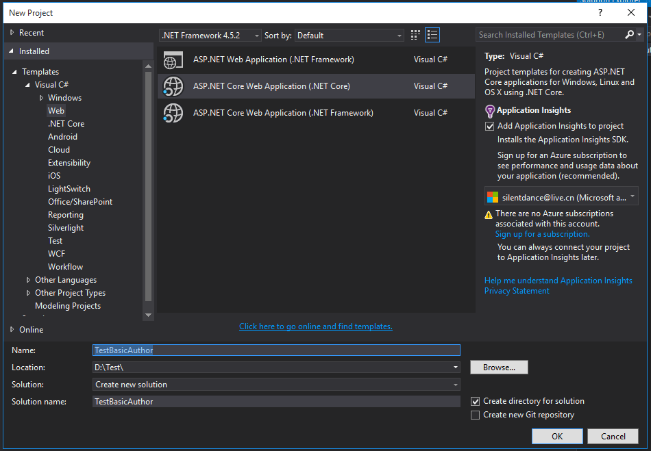 在VS中新建项目,项目类型选择ASP.NET Core Web Application (.NET Core), 输入项目名称为TestBasicAuthor。