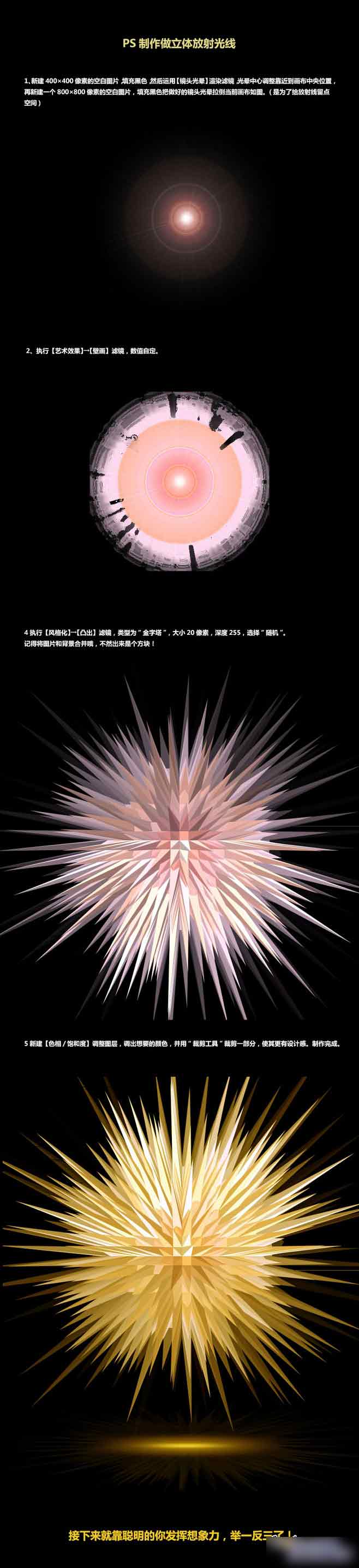 以上就是无奈蜻蜓最近收集整理的关于利用PS滤镜快速简单制作漂亮的立体放射光线效果的全部内容,更多相关利用PS滤镜快速简单制作漂亮内容请搜索靠谱客的其他文章。
