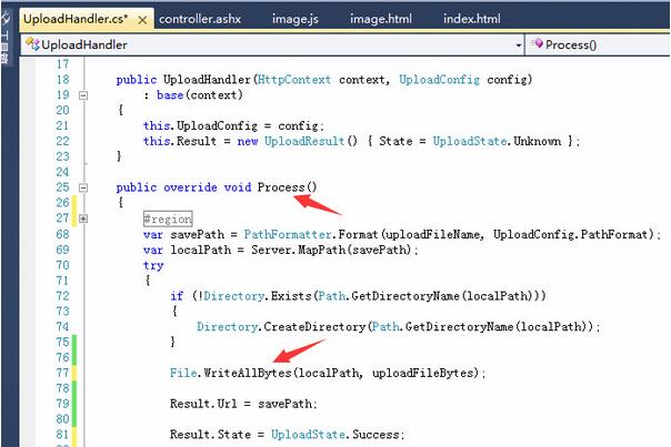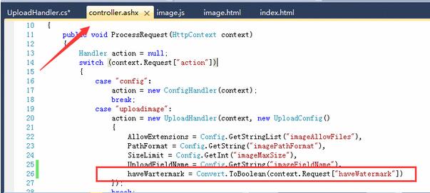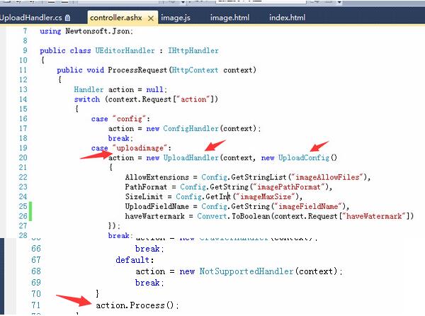 前台传过来的参数action 参数值为uploadimage ,类action 由派生类 UploadHandler进行实例化,UploadHandler 又通过构造函数注入 UploadConfig类的实例,最后由action.Process()调用: