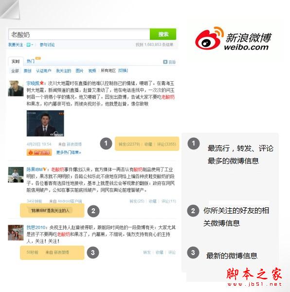根据笔者对于微博内容的初步研究,笔者发现一个有趣的问题,那就是百度的搜索结果中微博内容的排名算法并不同于微博平台搜索的排名算法。笔者将以新浪微博为例分析其中的不同。我们可以看到微博平台的微博搜索算法更加趋势与社会因素。如下图新浪微博平台中搜索“老酸奶”关键词后的微博内容排名结果。我们可以看到被广泛评价和转发的微博内容会排在第一,而排在第二的一般是我们关注的人所发的相关微博内容。排在第三的则是最新发表的微博内容。