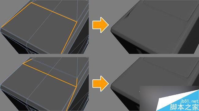 对于模型的布线,四边面当然是最优的选择了,实在没有办法分割出合理的四边面也没有关系,因为这件物体并不会像角色关节那样长生形变,只要圆滑后没有皱褶就可以了,不过这里提一点,即便是有少量的三角面,也应该要尽量减少类似这种狭长三角面的出现,狭长三角面这样的布线在圆滑之后,产生的皱褶往往比多边面还要可怕,可以适当的增加布线来解决这个问题。