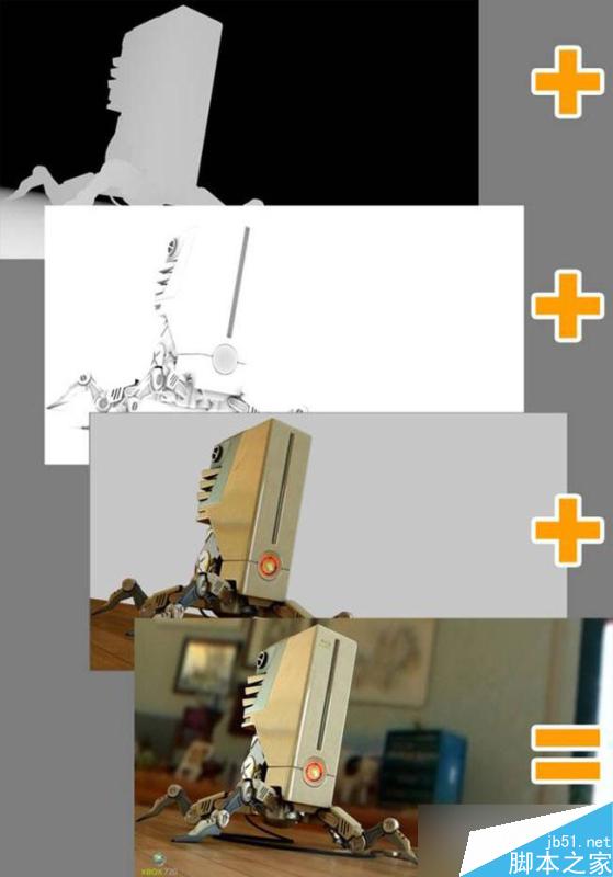 模型场景分别输出z通道,ao,diffuse储存成相应的文件格式,背景可以直接渲染摄像机视图中的hdri为一张jpg,这样合成之后背景上的光照方向才能和模型上的高光等一致,有锯齿或精度不够都没有关系,在photoshop中加个模糊,模拟出比较强的景深效果,可以把每个需要输出的通道文件单独储存为一个max文件,输出的时候以防万一,最后将几组素材放到photoshop中合成、效色,比较简单。