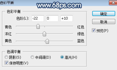 8、创建色彩平衡调整图层,对中间调,高光进行调整,参数设置如图12,13,确定后用黑色画笔把不需要调色的部分擦出来,如图14。