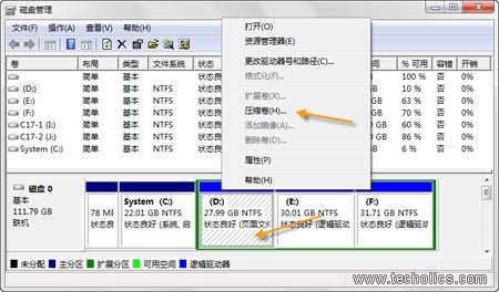 下面我们看一下如何压缩一个分区(也就是我们看到的C盘、D盘等),分出一部分建立一个新分区的。在需要减少大小的盘符上点右键选择压缩卷。