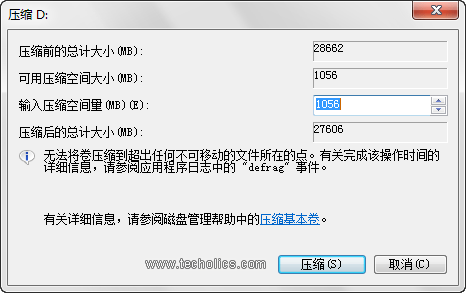 之后系统会弹出一个提示窗口“正在查询卷以获取可用压缩空间,请稍候”。分析完成后会出现一个新调整分区对话框。在上面可以看到压缩前的总计大小,也就是分区总的容量尺寸大小值。输入压缩空间量(MB)的数字表示有多少空间大小可以从当前分区中分出来创建一个新分区。