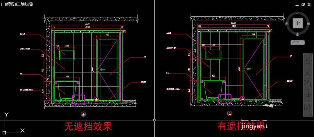 如果图中都是线性图形且最终要单色打印,通常不用太理会图形的顺序。但如果实体填充且与其他图形有重叠,就需要设置图形的顺序了,有时我们在插入一些设备或构件时,为了图面更整洁,会在图块中添加区域覆盖WIPEOUT,然后利用区域覆盖遮挡后面的图形,让图面看得更整洁一些,可以看一下例图中有无遮挡效果的对比。