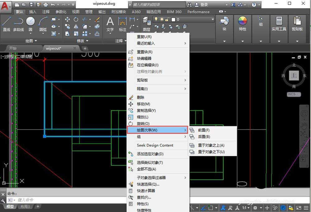 在实际绘图过程中我们显然不可能完全按照顺序来创建图形,比如在图块中添加区域覆盖WIPEOUT,通常都是绘制完图块的图形,然后根据图块的外轮廓来创建区域覆盖,由于区域覆盖是后创建的,会将图块中图形挡住,这时就需要我们手动来调整图形顺序。