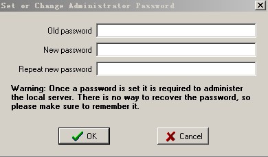 然后会出现如图7的界面。因为是第一次使用,所以是没有密码的,也就是说原来的密码为空。不用在old password里输入字符,直接在下面的New password和Repeat new password里输入同样的密码再点OK就可以了。这里建议设置一个足够复杂的密码,以防止别人暴力破解。自己记不得也没有关系,只要把ServUDaemon.ini里的LocalSetupPassword=这一行清除并保存,再次运行ServUAdmin.exe就不会提示你输入密码登录了。