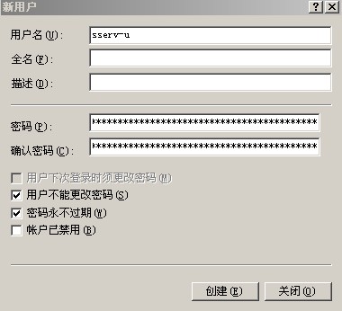 下面就到了该对SERV-U进行安全设置的时候了。首先建立一个WINDOWS账号SSERVU,密码也需要足够的复杂。密码要记住,如果记不住就暂时保存在一个文件里,一会儿还要用到。(见图8)