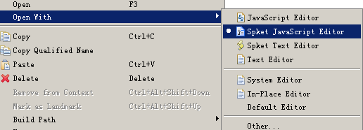 这时就需要我们在js文件上右键->Open With->Spket JavaScript Editor,这么选择了.