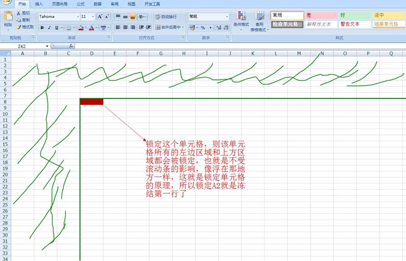 上面代码就是冻结表格的第一行,可能大家会对这个方法有些疑惑,为什么这样就是冻结第一行,下面这张图解释了原理