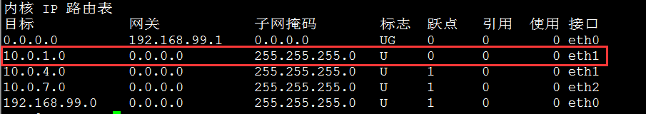 root@h7:~# route -n内核 IP 路由表目标 网关 子网掩码 标志 跃点 引用 使用 接口0.0.0.0 192.168.99.1 0.0.0.0 UG 0 0 0 eth010.0.1.0 10.0.4.2 255.255.255.0 UG 0 0 0 eth110.0.4.0 0.0.0.0 255.255.255.0 U 1 0 0 eth110.0.7.0 0.0.0.0 255.255.255.0 U 1 0 0 eth2192.168.99.0 0.0.0.0 255.255.255.0 U 1 0 0 eth0