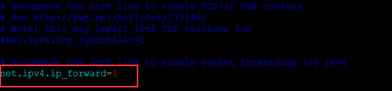 3)在4号机配置路由转发功能,即将/etc/sysctl.conf文件里面的net.ipv4.ip_forward的值置1: